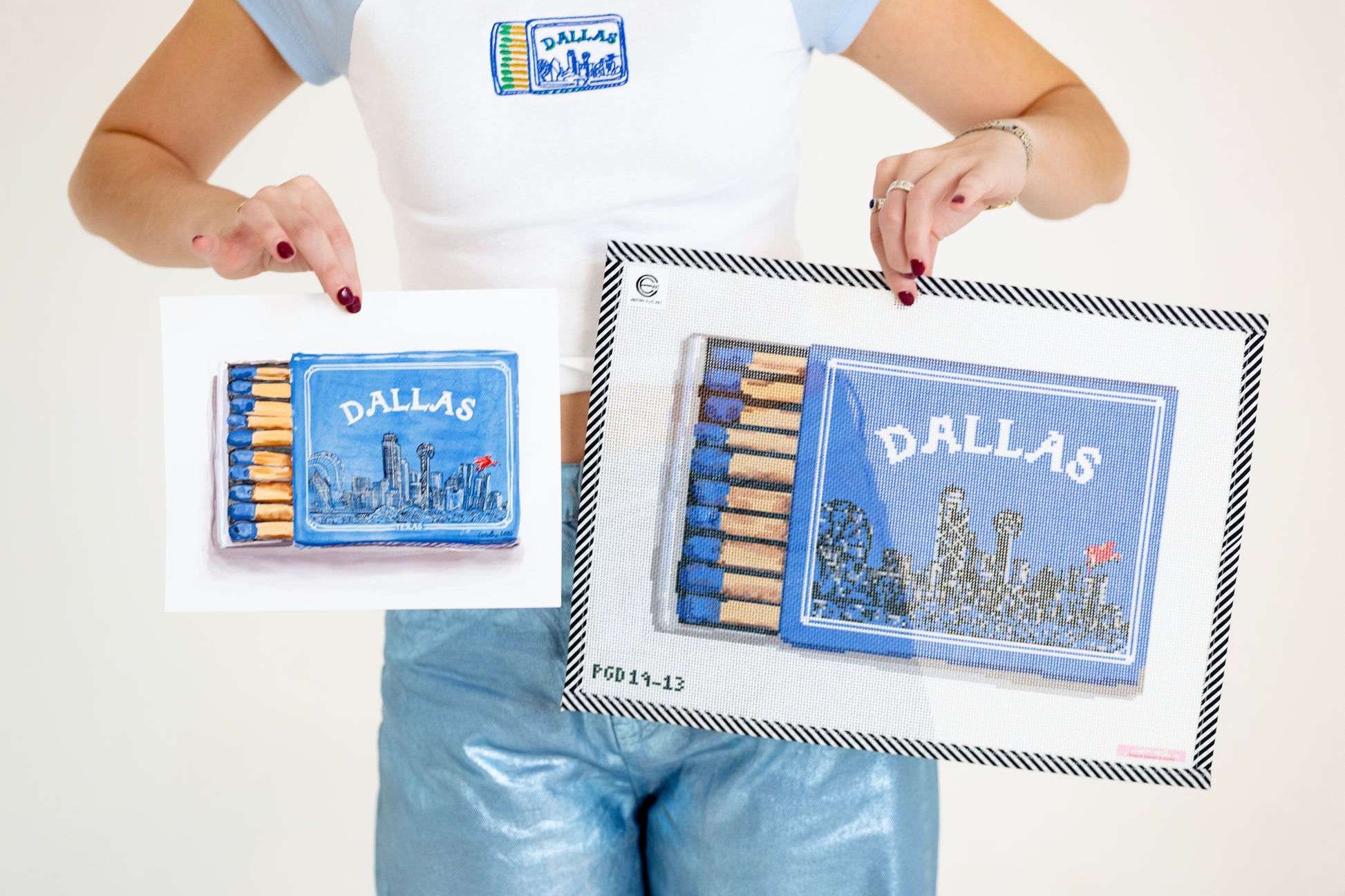 A charming collaboration between Perrin Gentry Designs and Caroline Ellis Art (@carolineellisart) this 13 mesh needlepoint canvas captures the heart of Dallas in the style of a vintage matchbox. Featuring iconic Dallas elements with a girly, whimsical twist, it’s the perfect piece for any Texan needle pointer or anyone who loves the Lone Star State. Designed with love by cousins Perrin and Caroline, this canvas blends signature flair from both brands—think soft pastels, elegant detailing, and a touch of trendy fun!
